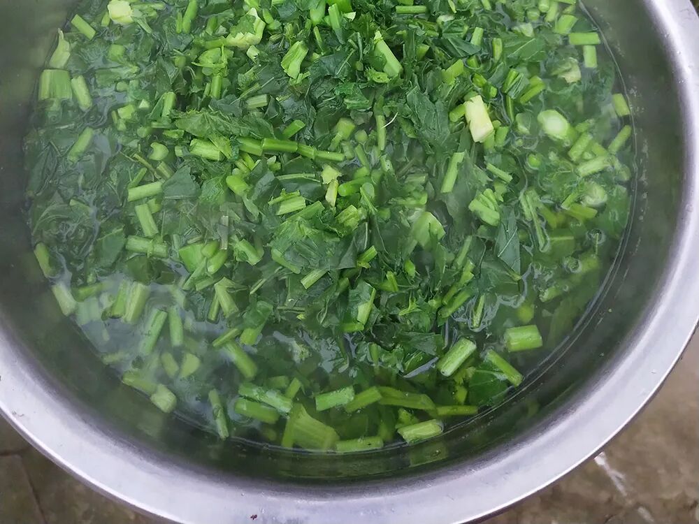 首先,将新鲜的野油菜采挖回来,用开水将其烫的发黄,然后捞出搭在架子上晾晒,晒至半干就可以取下来了,然后反复三四遍即可。这一步是为了让其最后做成梅干菜时颜色好看,味道更醇厚。