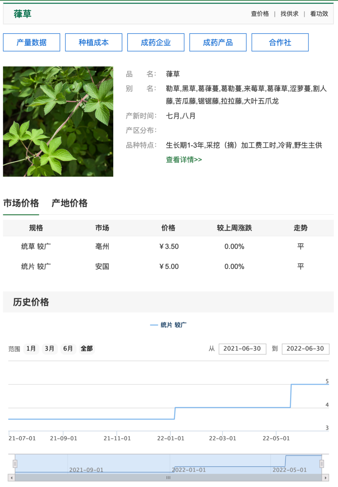 在近些年,葎草也逐渐被开发成药材和啤酒花的替代品开始应用了,据笔者所查阅到的资料来看,目前的价格虽然不贵,但也是一直在涨,一些地区都涨到5元一公斤了。所以若是能够合理的开发利用,也能将农村野外的那些成片生长的野生葎草“变废为宝”,给农民们带来一些额外收入。