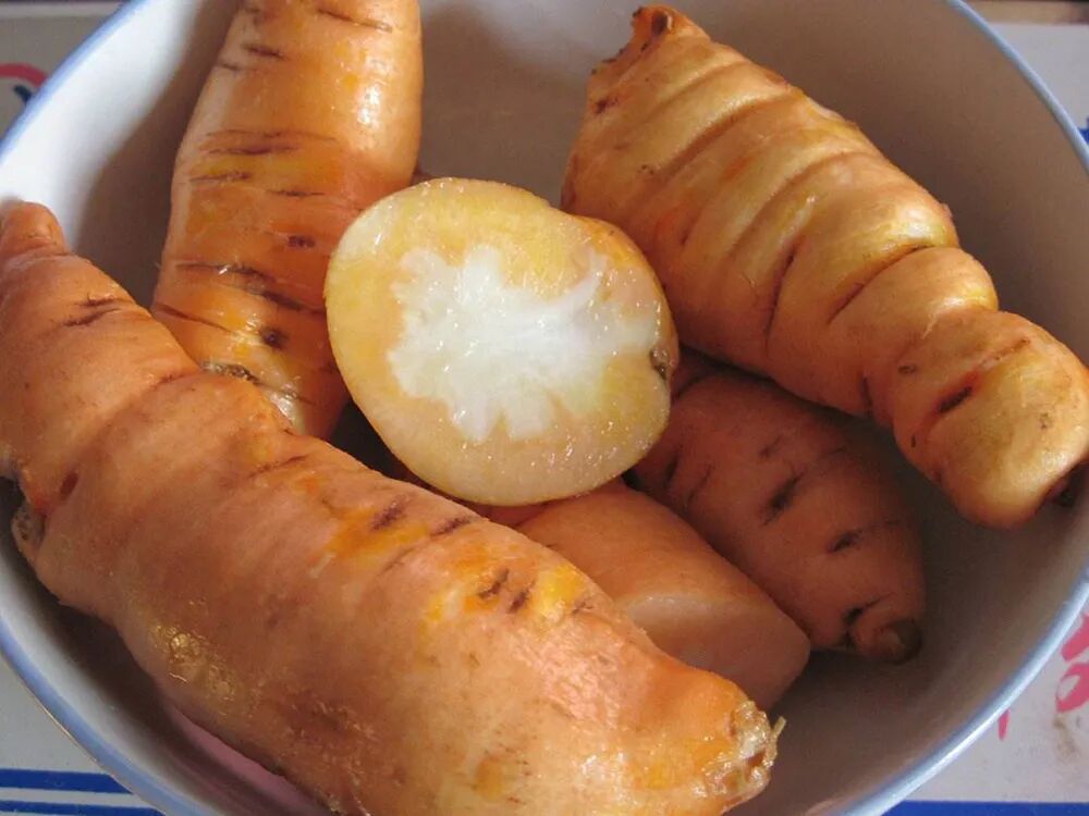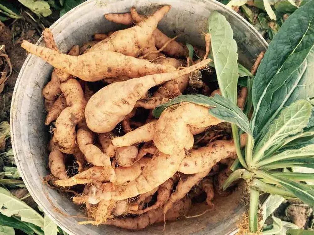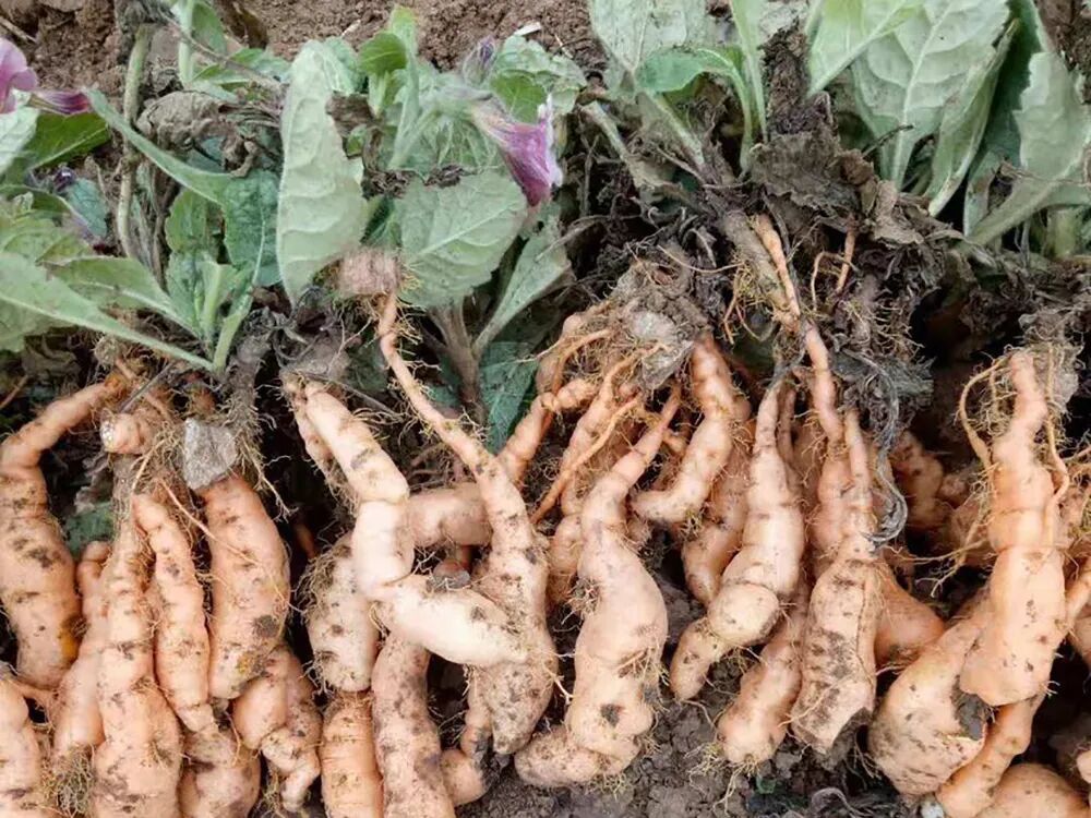 然而地黄的珍贵之处不在于带有甜味的花朵,而是它的块根。地黄的根是非常肥厚的肉质根,把它挖出来之后就能看到,根部像小番薯一样,表面颜色为黄色,洗干净表面泥土后就可以看到它的颜色真的是很鲜亮的黄色,这也是它地黄名称的由来。