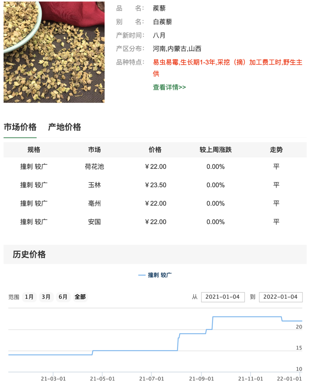 这样一来,蒺藜的需求量就大大提升,而目前我国专门种植蒺藜的也不多,主要还是靠野生供给为主,在供小于需的情况下,蒺藜的市场价格也就年年上涨了,据资料显示,截至去年12月,蒺藜的市场价格在20元一斤上下,算得上是名贵中药材了。