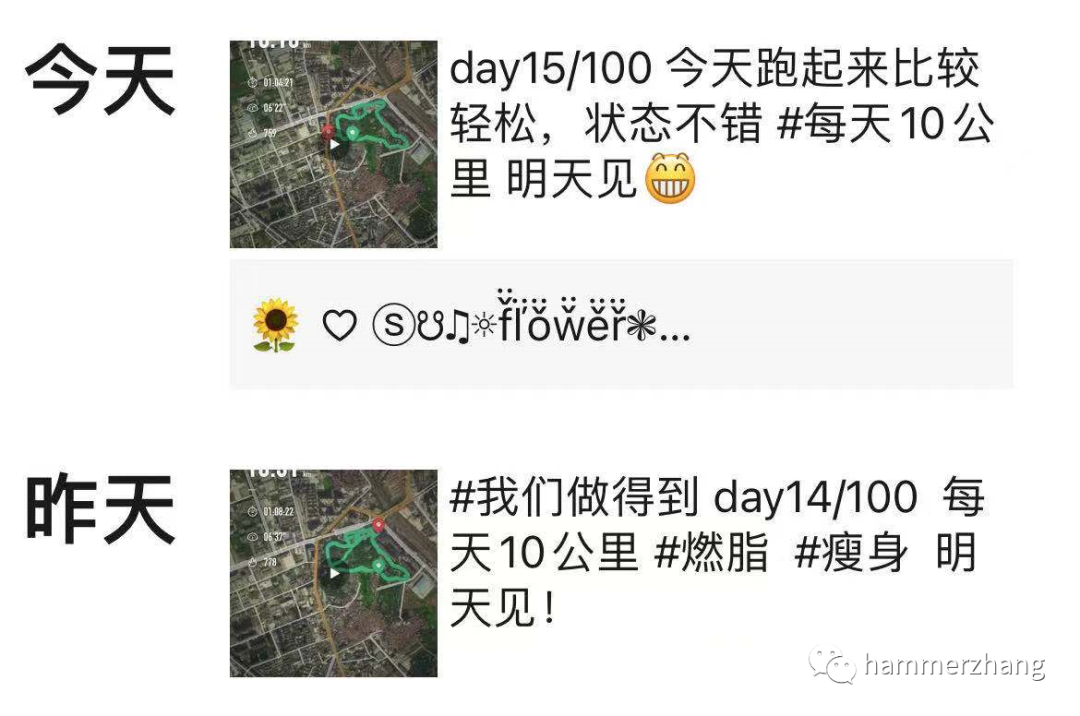 第一个是日常跑步的朋友,本来觉得自己每天跑个三五公里挺不错的,没想到别人直接每天10公里,超级自律的人。