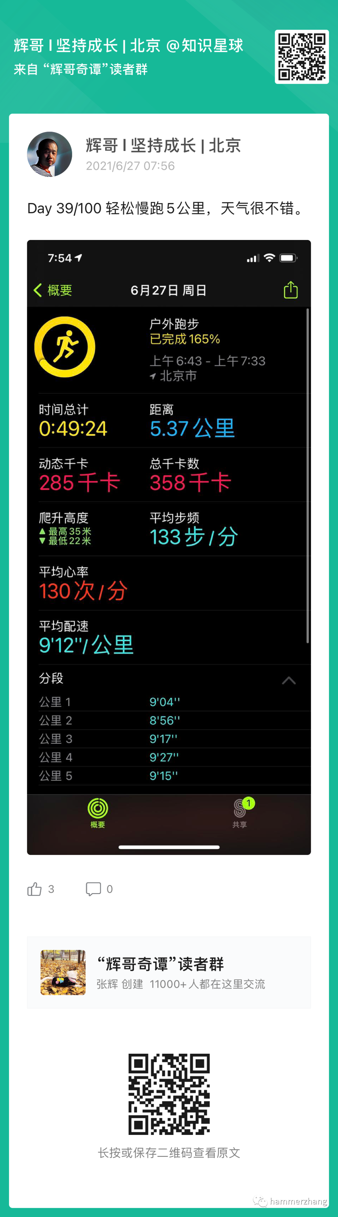 看到辉哥每天运动打卡,慢跑半小时,配速在9分多1公里,经常跑步的朋友应该都知道这个速度是算很慢的,但辉哥已经连续用这个速度跑了39天。
