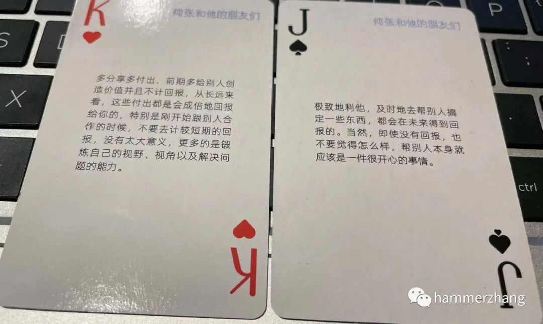 今天翻看了一下帅张的扑克牌,找到两张还不错的牌,红心K和黑桃J,从事销售岗位以来,其实一直都是在利他,帮别人去分析平台的一些提升点,怎么做好平台。