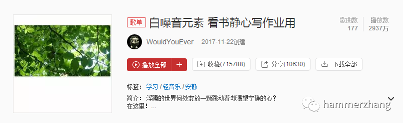 说出来大家可能不信,我第一次听白噪音还是在17年大学的时候,同桌分享了一个歌单过来,听的时候感觉很舒适,据说有治疗作用,同时还有助于提高工作效率和集中注意力,在嘈杂的环境中让你的内心安静下来。