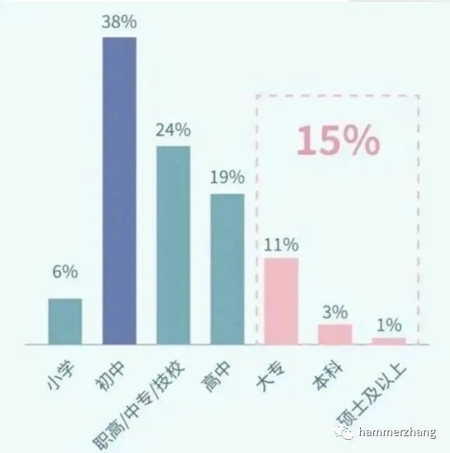 相关媒体报道,中国外卖小哥近700万,从学历来看初中生最多,大学生占比约15%,其中,硕士生占比1%,约7w人。