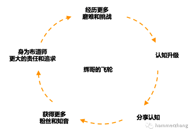 我的飞轮是什么?简而言之是认知提升和传播认知(布道)之间的正向互动。简单的循环如下:经历磨难和挑战 ->认知提升->分享认知->获得更多粉丝和知音->身为布道师有更大的责任和追求->遇到更多磨难和挑战->进一步提升认知…