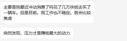 压力永远是最好的动力,其实我说再多,也没有用。当你没有压力的时候,一个人也能过得很好。但当你压力慢慢变大之后,比如大部分男生会遇到的买房买车,大部分女生会遇到的怀孕生娃,你就会发现有钱是多么重要。