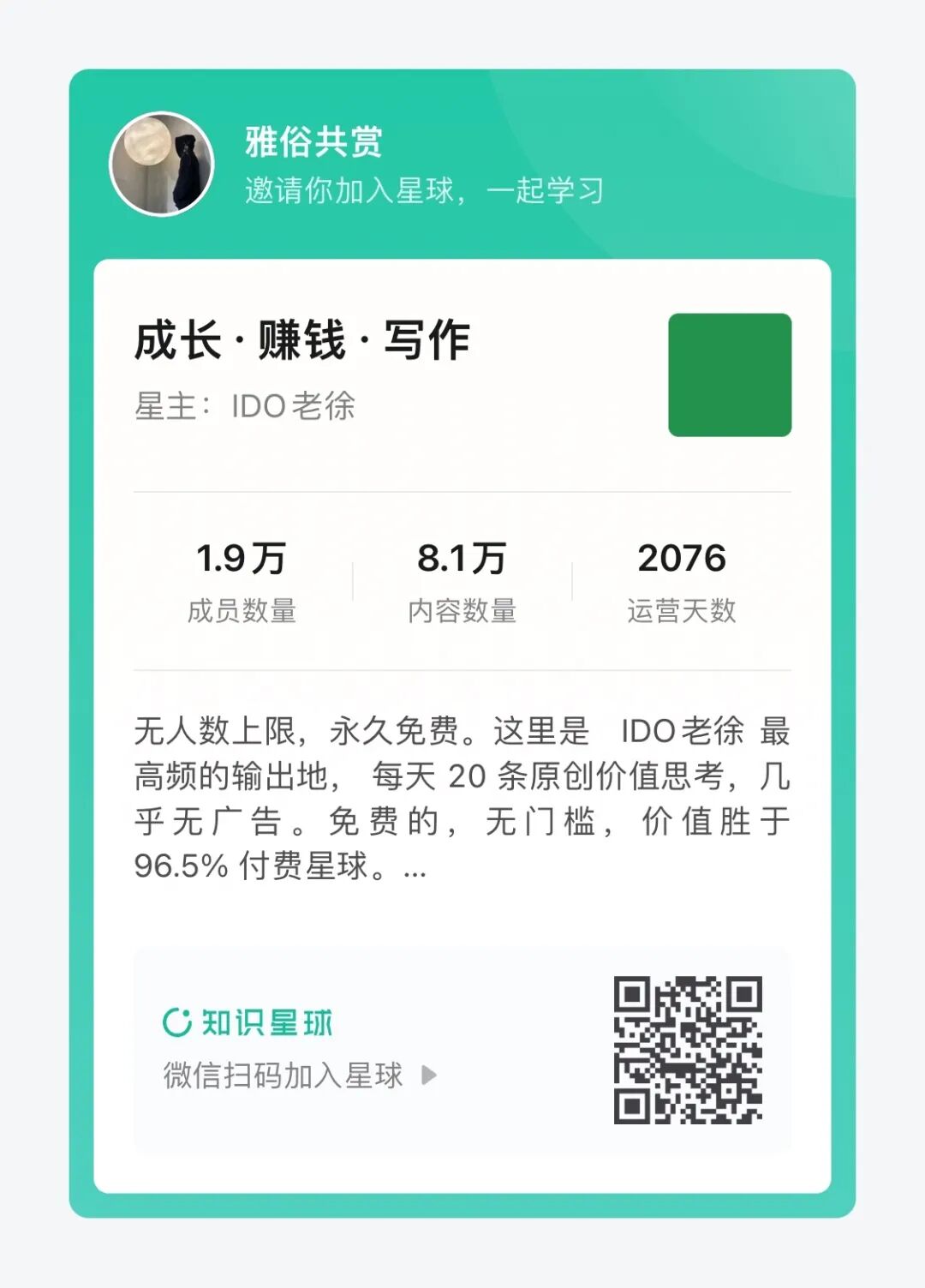 在老徐的“成长 写作 赚钱”免费知识星球里面,累计用户接近2w,每天都有一大批人打卡写作,即使是50字,即使每天工作很忙,也能做到日更写作。