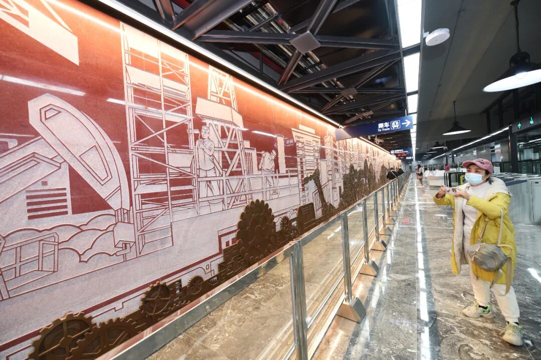 武汉地铁5号线武钢站内壁画,展现了武钢的“光辉岁月”。(湖北日报全媒记者 李溪 摄)