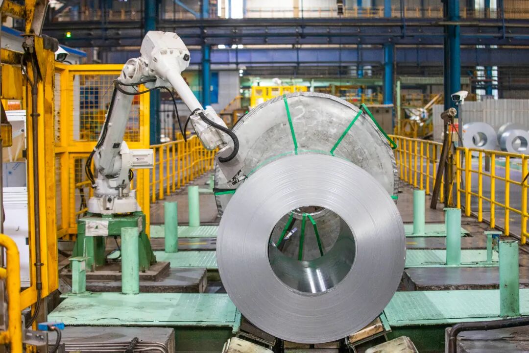 武钢有限冷轧厂内,自动贴标机器人正在为出厂钢卷贴标。(湖北日报全媒记者 何宇欣 摄)