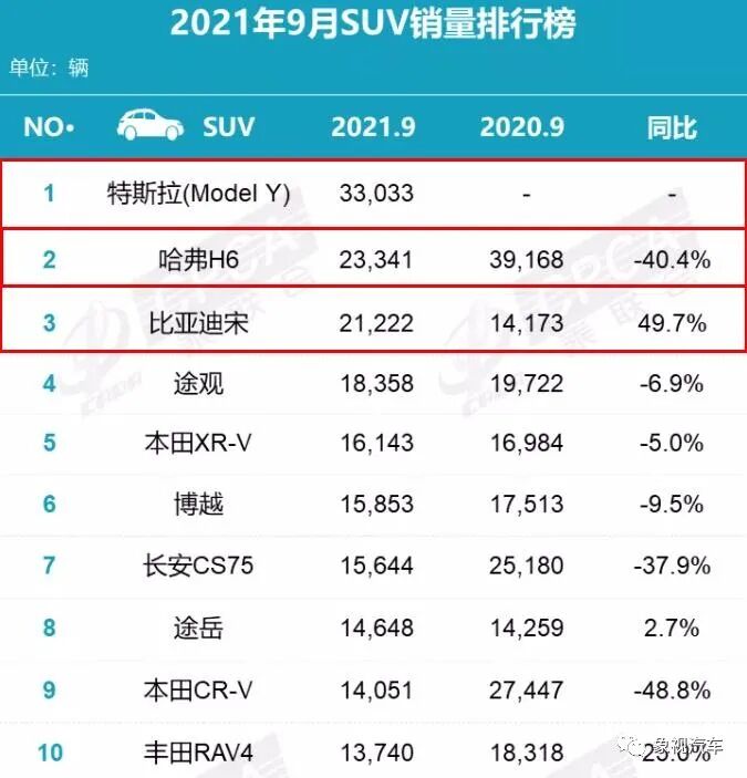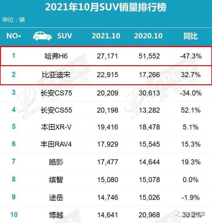 根据乘联会月度零售销量排名快报,哈弗H6今年8月份销量仅为17391台,同比下滑32.9%;9月份销量为23341台,同比大跌40.4%;一直到10月份,销量断崖式下滑。而且在9月份,哈弗H6被特斯拉Model Y的33033台大幅超越,同时最近三个月被比亚迪宋紧追不舍。