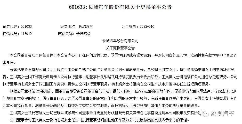 新旧年交替之际,各大汽车厂商都在发布销量业绩,而一则重磅人事变动,让长城汽车再次成为顶流。在公告,长城称公司董事会收到公司副董事长、总经理王凤英的书面辞职报告,王凤英因工作需要申请辞去公司执行董事、副董事长及战略及可持续发展委员会委员职务,将继续在公司担任总经理职务。