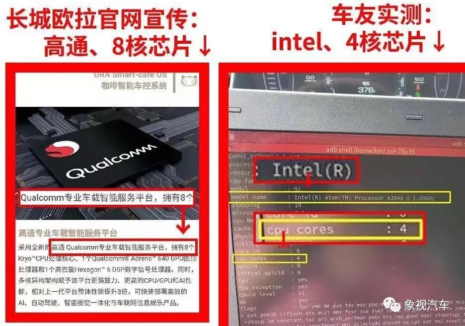 也许是巧合,长城股价大跌与欧拉“换芯门”几乎同一时间发生。去年下半年,多名车主发现,欧拉好猫车机芯片是英特尔Atom A3940,而非厂家一直宣传的性能更好的高通八核芯片,引发舆论一片哗然。