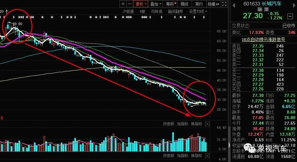 然而让人始料未及的是,从那之后长城股价仿佛断线的风筝,一路走低。截至3月28日收盘,长城股价仅为27.30元,和高点相比已经暴跌60%,市值更是蒸发近4000亿。