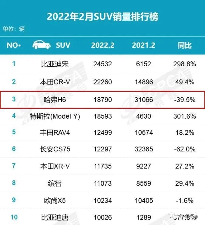 乘联会数据显示,哈弗H6在2月份销量同比大跌39.5%,仅有18790辆,不敌比亚迪宋和本田CR-V,销量排名滑落至第三名;