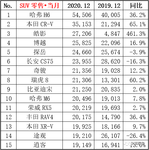 大众从2018年开始投放了探歌、探岳SUV新车型,短短三年时间就从3款车型,扩大到12款车型,并且2022年预计会高达16款车型,覆盖小型、紧凑、中级、大型、轿跑、越野、电动等SUV所有的细分市场。本田也向大众学习双车战略,推出的CR-V的姊妹车型皓影,成为去年SUV市场最大的黑马,在12月销量排行榜上,CR-V和皓影紧跟哈弗H6,拿下亚军和季军。而且,两者合计销量超出哈弗H6近8000辆,将哈弗逼到了墙角。