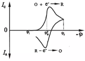 2.电极反应为O+ne-=R。当初始反应物中只有O而没有R,且扫描的起始电势比O/R体系的标准平衡电势更正时,开始扫描一段时间内电极上只有不大的充电电流通过。当电极电势接近平衡电极电位时,O开始在电极上还原,并随着电势变负出现越来越大的还原电流。当还原电势显著超越平衡电极电位后,又因表面层中反应物的消耗使电流下降,从而形成峰。反向扫描时又得到氧化电流的峰值。