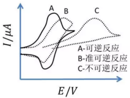 若反应可逆,则曲线上下对称(A曲线);若反应不可逆,则曲线对称性较差且氧化还原峰的高度不同。
