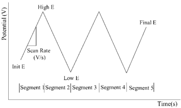 循环伏安法:在电极上施加一个线性扫描电压,从起始电位以一定的速率扫描到一个顶点电位,再从该顶点电位扫描到另一个顶点电位的两阶段,此扫描可以在两个顶点电位之间多次重复(输入信号如上图所示)。