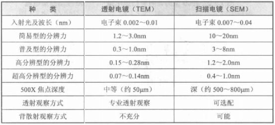 透射电镜和扫描电镜在分辨力和焦点深度等方面也是不同的(如下图所示)。