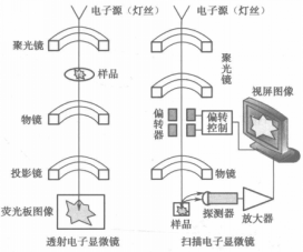 为了方便对透射电镜与扫描电镜的结构比较,大家可参考下面这个简略图(其中,样品位置不同是很大的不同点)。