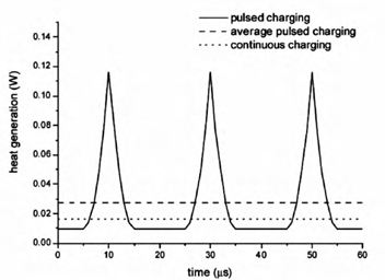 有研究表明,利用商业锂电池的实验测试可以验证连续充电和脉冲充电之间的发热差异。从上图可以看出,微秒脉冲时间可以促进锂电池中产生更多的热量。