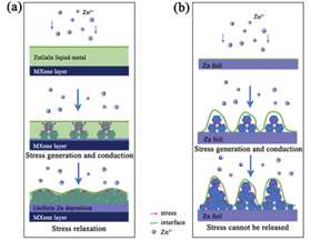 分别在ZnGaIn // MXene和Zn箔上镀锌的示意图(图片来源:Stress-Release Functional Liquid Metal-MXene Layers toward Dendrite-Free Zinc Metal Anodes)