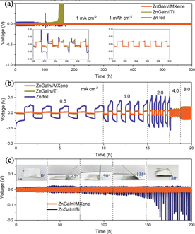 以ZnGaIn // MXene、ZnGaIn // Ti和Zn箔为负极的对称电池的循环和倍率性能(图片来源:Stress-Release Functional Liquid Metal-MXene Layers toward Dendrite-Free Zinc Metal Anodes)