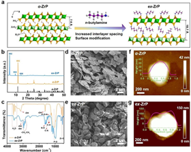 X射线衍射峰左移,说明层间距增加,可间接证明正丁胺成功插入α-ZrP。FT-IR光谱中也出现了正丁胺的特征吸收峰。SEM图像显示,α-ZrP由超薄六边形纳米板组成,表面光滑平整,厚度约为35 nm。AFM图像表明,插入正丁胺后,纳米板的横向尺寸基本保持不变,但厚度增加到~120 nm。