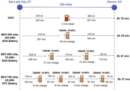 如下图所示,文中比较了使用不同电量电池包的电动汽车从盐湖城到丹佛的行驶时间。由图可知,虽然45 kWh电池的续航里程有限,在行程中需要四次充电,但总续航时间与其他两款大电量电动汽车非常相似,仅比传统ICE车多27分钟,这表明其在消除里程焦虑中的巨大潜力。此外,更小的电池意味着具有更低的成本、与材料相关的挑战更少、与制造相关的碳排放量更低。因此,XFC和小型电池搭配的战略符合可持续性发展的目标。