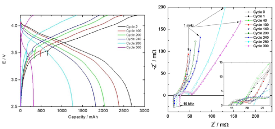 左:电池容量随循环次数(0.8C)的变化,右:EIS谱随循环次数的变化(0.8C,25% SOC)(图片来源:ChemistrySelect论文)