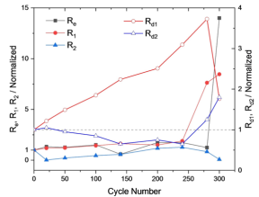 如上图所示,内阻(Re)似乎并不是提供SOH信息的适当参数,这与一些文献报道一致。与SOH信息最敏感参数似乎是Rd1,因为该参数电阻在有规律地增加。该增加与循环200圈之前SEI厚度的逐渐增加相一致。