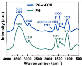 下图是PG(PG:桃胶)和PG-c-ECH(ECH:环氧氯丙烷)的FTIR。作者已经将不同波数下的吸收峰在图中标出,这里不再过多说明。