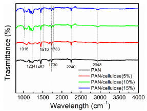 PAN和PAN/cellulose(纤维素)(5%、10%、15%)复合隔膜的FTIR(图片来源:)
