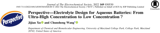 参考文献:Perspective—Electrolyte Design for Aqueous Batteries: From Ultra-High Concentration to Low Concentration?Jijian Xu and Chunsheng Wang 2022 J. Electrochem. Soc. 169 030530