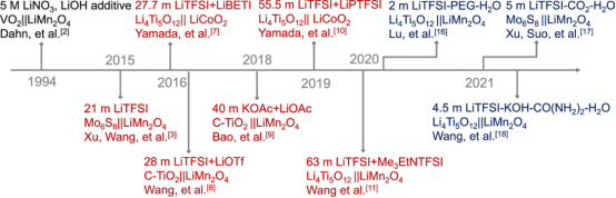 当LiTFSi浓度增加到21 M时,在水还原生成的OH−的催化下,盐可以被还原成坚固的SEI,从而电化学稳定窗口可扩大到3.0V。不幸的是,高浓度盐本身就提高了电解液的成本,所以开发低浓度、高压的水基电解液是必须的。