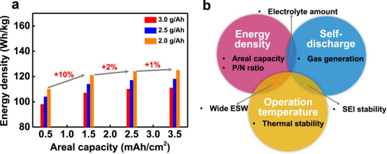 在<0.5mAh cm−2的低面积比容量下,电池在粘度高、离子电导率低、润湿性差的超浓水溶液中可以获得高倍率性能和长循环寿命。面积比容量增加则会导致极化增加,活性物质利用率较低,倍率性能较差。因此,水系电池的面积比容量在很大程度上取决于电解质的离子导电性、粘度和润湿性。基于简化的LiMn2O4 || Li4Ti5O12电池,作者计算了不同面积比容量下的能量密度。如下图所示,在电解液为3 g A−1h−1的情况下,将面积比容量从0.5 mAh cm−2增加到1.5 mAh cm−2,电池能量密度从98 Wh kg−1增加到107 Wh kg−1。当进一步将面积比容量从1.5 mAh cm−2增加到2.5 mAh cm−2时,预计能量密度增加2%。这表明,对于特定的LiMn2O4 || Li4Ti5O12体系,1.5 mAh cm−2和2.5 mAh cm-2的面积比容量是有利于获得较高能量密度的最佳值。