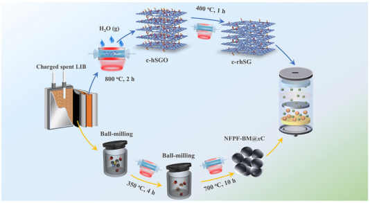 从废旧LIB中合成c-rhSG和NFPF-BM@xC的示意图并用于SIB(图片来源:Materials Today Energy)