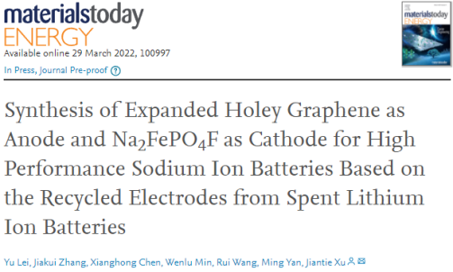 Synthesis of Expanded Holey Graphene as Anode and Na2FePO4F as Cathode for High Performance Sodium Ion Batteries Based on the Recycled Electrodes from Spent Lithium Ion Batteries. YuLei, JiantieXu, Materials Today Energy, 29 March 2022, 100997.