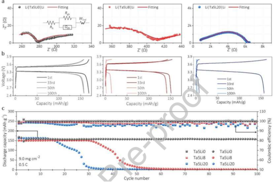 本文开发了一种基于固相反应的低成本、高效率、无溶剂合成石榴石型固态电解质的方法。通过控制原料的化学计量比和合成路线,以及石榴石的形貌、物相组成和相对密度,制备了不含过量Li2O的湿稳定石榴石LLZT(Ta5Li0)。合成的Ta5Li0样品具有良好的颗粒形态,晶界较少,室温离子电导率为7.36×10−4S cm-1,相对密度为97.5%。Ta5Li0表现出优异的水稳定性:在富含水和CO2的气氛24小时后,Ta5Li0的离子电导率略有下降,降至6.6×10^-4 S·cm·-1;在水浸试验中,Ta5Li0仅使去离子水的pH值在第一次浸泡时从6.0提高到7.7,在随后的浸泡中几乎没有变化。Ta5Li0的这种水分稳定性一方面可以归因于晶界的大大减少和晶界上的物质(如Li2O),另一方面也可以归因于颗粒的性质。TOF-SIMS深度剖析表明,Ta5Li0颗粒上没有H+/Li+扩散层。DFT计算表明,缺Li石榴石晶格与H2O的反应性降低,表明颗粒性质的重要性。为了进一步测试锂与石榴石的相容性,我们用水浸泡的Ta5Li0颗粒组装了对称的锂电池和Li|LLZT|LFP电池。Ta5Li0颗粒与Li的界面电阻为14.6 Ω cm2,Li|LLZT|LFP电池在0.5C和60°C下稳定循环100次,库仑效率接近100%,第100次放电容量为158.1 mAh g-1。