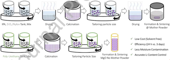 新的合成路线的特点是:不使用溶剂、不过量锂盐、不牺牲母粉和10分钟快速烧结。简化了工艺流程,节省了混合、干燥和退火时间,整个合成路线周期缩短至24小时。