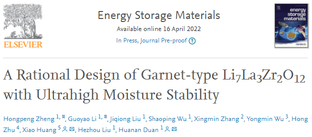 Zheng H, Li G, Liu J, et al. A Rational Design of Garnet-Type Li7la3zr2o12 with Ultrahigh Moisture Stability[J]. Energy Storage Materials