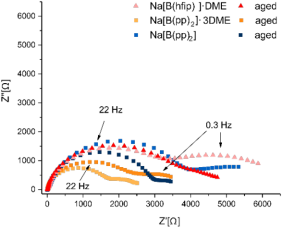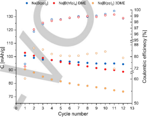 剑桥大学的Darren M.C. Ould等人合成了一系列的硼酸钠盐,电化学研究表明,Na[B(hfip)4]·DME(hfip=六氟异丙氧基)和Na[B(pp)2](pp=perfluorinated pinacolato, O2C2(CF3)4)具有良好的电化学性能。[B(pp)2]−阴离子对空气和水也有很高的耐受性。阻抗谱和循环伏安表明,两种电解液都比常规使用的NaPF6提供了更稳定的电极/电解液界面。此外,它们为SIBs提供了更好的循环稳定性和与NaPF6相当的容量。