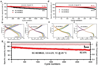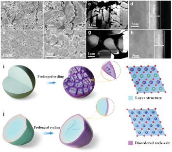 PC-NCM622和SC-NCM622颗粒的降解机理如上图i,j所示。在长时间循环后,严重的裂纹形成导致PC-NCM622颗粒粉碎,而SC-NCM622颗粒只出现少量微裂纹。此外,阳离子无序层(以紫色表示)仅形成在SC-NCM622颗粒的表面;另一方面,而它会沿着与电解液接触的晶间裂缝渗透到PC-NCM622颗粒体中。