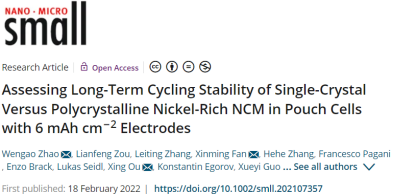 Zhao W, Zou L, Zhang L, et al. Assessing Long‐Term Cycling Stability of Single‐Crystal Versus Polycrystalline Nickel-Rich NCM in Pouch Cells with 6 mAh cm-2 Electrodes[J]. Small, 2022, 18(14): 2107357.