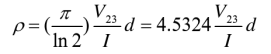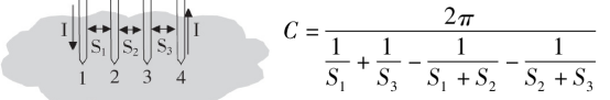 此时,从探针1流入和探针4流出的电流的等位面近似为圆柱面(高为d),任一等位面的半径设为r,当r12 = r23 = r34 = S时,则计算公式为: