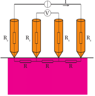 施加直流电流I于外侧两个探针上(1和4),在中间两个探针(2和3)上用高精度数字电压表测量电压(U23)。