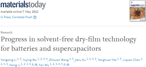 Yongxing Li, Yujing Wu, Zhixuan Wang, Jieru Xu, Tenghuan Ma, Liquan Chen, Hong Li, Fan Wu. Progress in solvent-free dry-film technology for batteries and supercapacitors, Materials Today, May 2022.