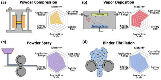 3.粉末喷涂。该方法通过装置将粉末施加到集流体上,然后通过热轧将粉末固定在集流体上。粉末喷涂技术已经发展非常成熟,但用于大规模生产储能装置的报道还没有很多。粉末喷涂生产可采用卷对卷(roll-to-roll)生产,表面能量密度和电极尺寸超过了动力电池和便携式电子设备的要求。因此,它适用于储能领域,如ASSBs、SCs(超级电容器)、LIBs等的电极和电解质层。
