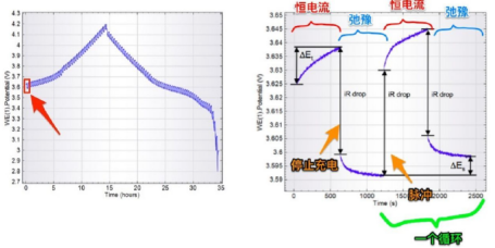 GITT(Galvanostatic Intermittent Titration Technique):恒电流间歇滴定技术,是一种暂态测量方法。GITT测试是一个脉冲-恒电流-弛豫这样一个循环过程。其中脉冲指一个短暂电流经过过程,弛豫指无电流经过的过程。基本原理是:单位时间t内,施加恒电流I进行充电或放电,之后电流断开,同时记录恒电流过程和弛豫过程的电压变化情况。具体步骤可参考下例:以0.2 C的恒电流对NCM/Li半电池充电10 min,然后搁置1 h使之达到平衡状态,继续循环该过程至上限电压。放电过程可参考充电过程。